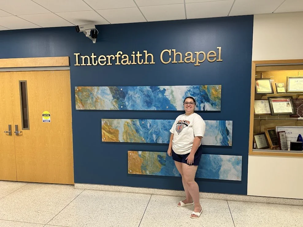 The objective was to draw more attention to the entrance of the Interfaith Chapel from the lobby and check in area. The owner requested a stained glass look with a focus on wayfinding.
